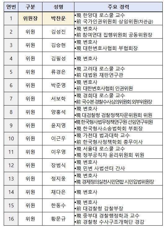 자문위원회는 박찬운 위원장(한양대 로스쿨 교수)을 포함한 법조계·학계·연구기관·시민단체 등 각계 전문가 16명으로 구성됐으며, 향후 1년간 추진단이 검찰개혁 업무를 수행하는 데 있어 다양한 쟁점 사항들에 대해 논의하고, 실현가능한 대안을 제시하는 등 자문 기능을 수행할 예정이다.