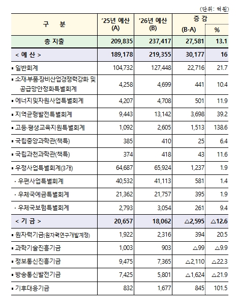 이는 2025년도 추경예산인 20조 9,835억원 보다 2조 7,582억원 증액된 규모로 우리나라의 저성장 국면을 돌파하고, 혁신경제로의 전환을 가속화하기 위해 범국가적 인공지능(AI) 대전환, 넥스트(NEXT) 전략기술 육성, 튼튼한 R&D 생태계 조성, 과학기술·디지털 기반 균형성장 등 4대 분야에 중점 투자한다.