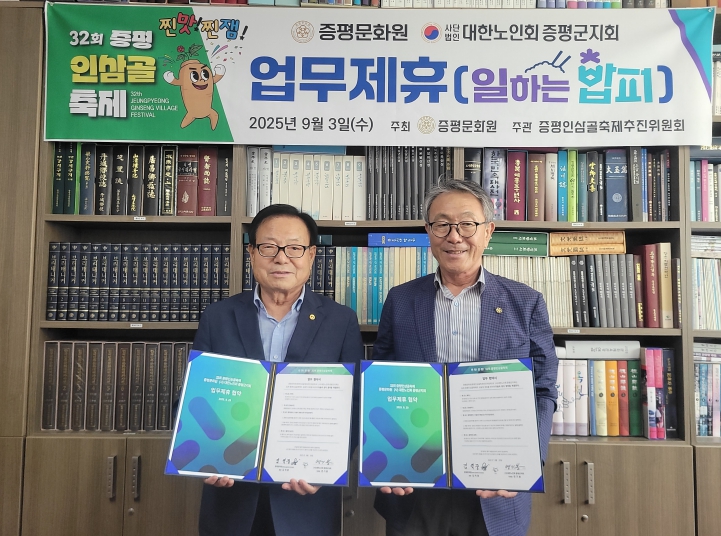 증평문화원(원장 김덕중)과 대한노인회 증평군지회(지회장 연기봉)는 3일 업무협약을 체결하고, 오는 9월 25일부터 4일간 열리는 인삼골축제의 성공 개최를 위해 힘을 모으기로 했다.