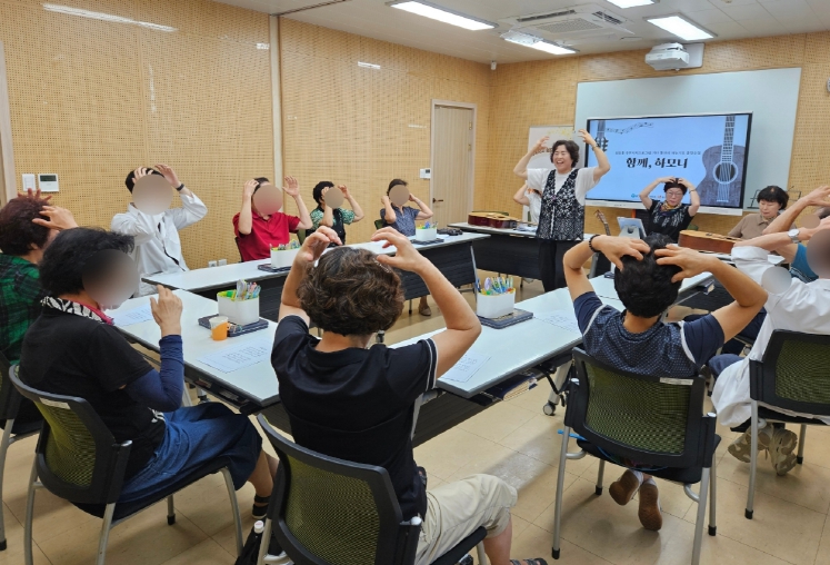이번 수업은 삼호동 주민자치프로그램 기타 동아리 회원들의 재능기부로 진행됐고 기타와 하모니카의 합동 연주, 노래 반주, 음악체조 등 모두가 부담없이 참여할 수 있는 활동들로 구성돼 치매 어르신들은 익숙한 가요를 따라 활발히 수업에 참여했다.
