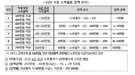 기존에는 국민연금 전체 가입자의 평균소득(이하 A값)보다 많은 근로·사업소득이 있는 경우, A값을 초과하는 월 소득을 100만 원 단위의 5개 구간으로 나누어 5~25%에 해당하는 금액을 연금액에서 감액했다. 초과소득월액이 100만 원 미만이면 최대 5만 원, 200만 원 미만이면 최대 15만 원이 연금액에서 깎이는 구조였다.