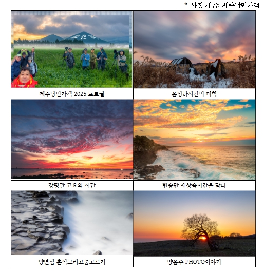 제주낭만가객은 2021년 5월 창립된 도내 사진 단체로, 제주의 자연과 유산을 기록하고 보존하자는 뜻을 함께하는 사진작가들이 모여 활동하고 있다. ‘자연을 잠시 빌려 쓰는 손님’이라는 마음으로 제주의 사계와 풍경을 카메라에 담아왔다.