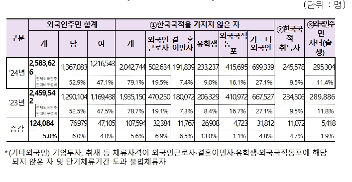 통계가 처음 발표된 2006년 이후 매년 증가했으며, 지난해 246만 명으로 외국인주민 수가 역대 최다를 기록한 데 이어, 2024년도 외국인주민 수도 증가세를 지속하며 사상 최대 규모를 다시 경신했다.
